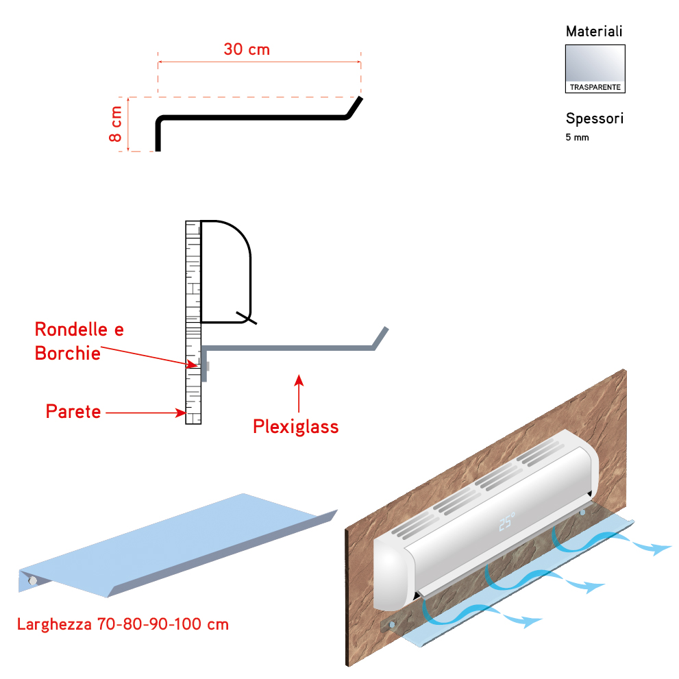 Contenuto della Confezione: 1 deflettore in plexiglass, 3 tasselli Fischer, 3 viti, 3 copri viti.
